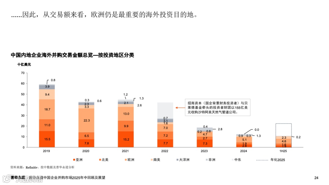 就交易量看,境内战略投资和风险投资基金交易分别增长17%和23%(2025年上半年相比2024年上半年);私募股权基金交易下降3%;境外战略投资者并购数量维持低位,仅有约30宗;中国内地企业海外并购也表现疲软,交易数量为133宗,同比下降6%。