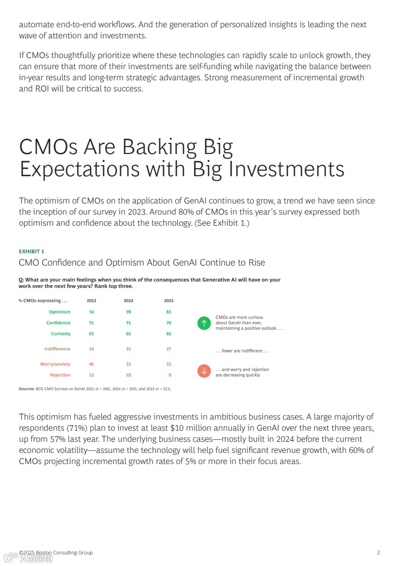 尽管经济形势波动,71% 的 CMO 计划在未来三年每年投入超过 1000 万美元用于 GenAI,高于去年的 57%。根据 Boston Consulting Group(BCG)的一项新调查,CMO 对 GenAI 的乐观情绪逐年攀升——从 2023 年的 74% 升至 2025 年的 83%——而担忧则迅速下降。