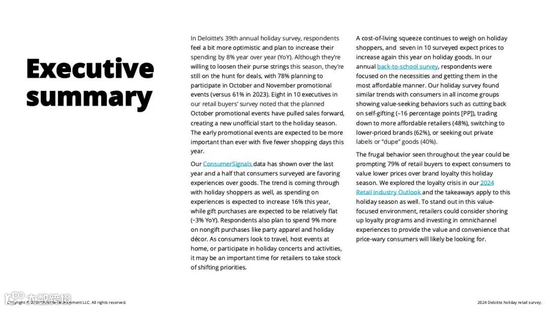 调查发现,消费者感到更加乐观,并计划将支出同比提高8%。尽管他们愿意在本季放松钱包,但仍在寻找更划算的交易。78%的人计划参加10月和11月的促销活动(2023年为61%)。对零售买家的调查中,80%的高管指出,10月份促销活动推动了销售,为假日购物季创造了一个新的非官方开端。由于今年的购物日减少了5天,预计早期的促销活动将比以往任何时候都更加重要。