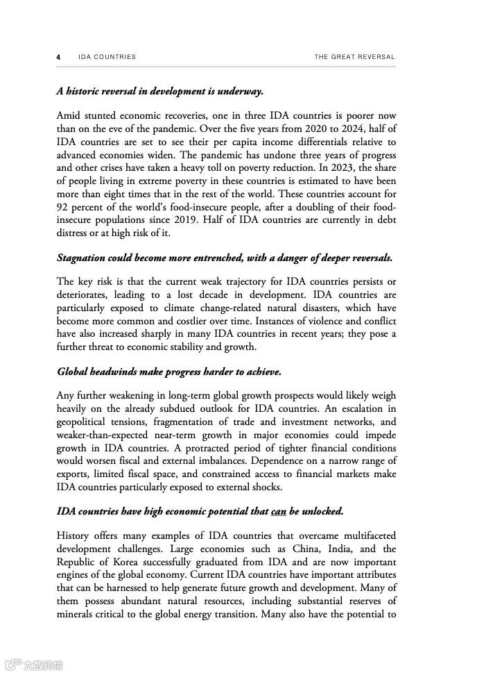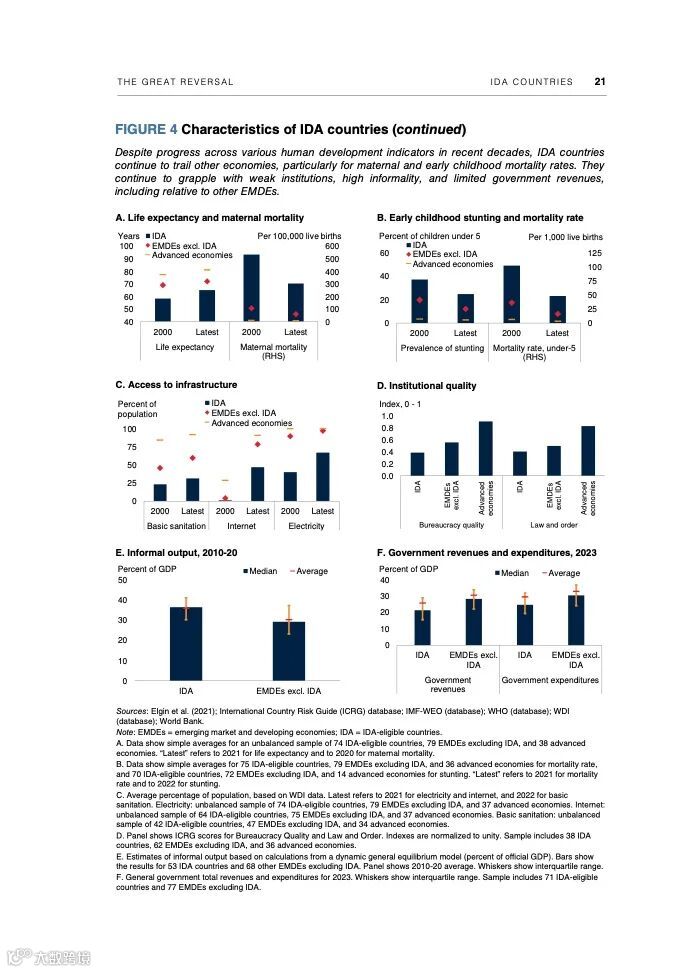 这份名为《大逆转:全球开发协会国家的前景、风险和政策》的报告首次全方位审视了有资格获得世界银行全球开发协会(IDA)赠款和无息或低息贷款的75个国家面临的机遇和风险。世界人口的四分之一——19亿人——生活在这些国家。在几乎所有其他地方都在老龄化之际,IDA国家的年轻人口比例在2070年之前不断提高——这是一个巨大的潜在“人口红利”。IDA国家还拥有丰富的自然资源,拥有巨大的太阳能发电潜力,以及对全球清洁能源转型至关重要的大型矿藏。