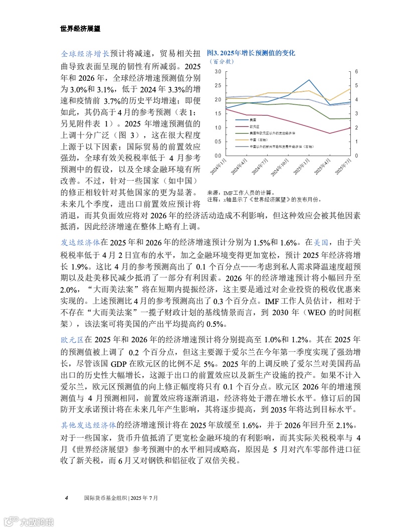 2025年和2026年,全球经济增速预计分别为 3.0%和3.1%。与2025年4月《世界经济展望》的参考预测相比,2025年的预测值高出了0.2个百分点,2026年的预测值高出了0.1 个百分点。这反映了多重因素,包括:加征关税预期下,进出口的前置效应强于预期;美国的平均有效关税税率低于其 4 月宣布的水平;美元走弱等因素推动金融环境改善;以及一些主要经济体实施了财政扩张。全球总体通胀率预计将于 2025年降至4.2%,于2026年降至 3.6%,其路径与4月的预测相似。上述总体情况掩盖了各国之间的显著差异,其中,美国的通胀预计仍将高于目标水平,其他大型经济体的通胀则较为低迷。