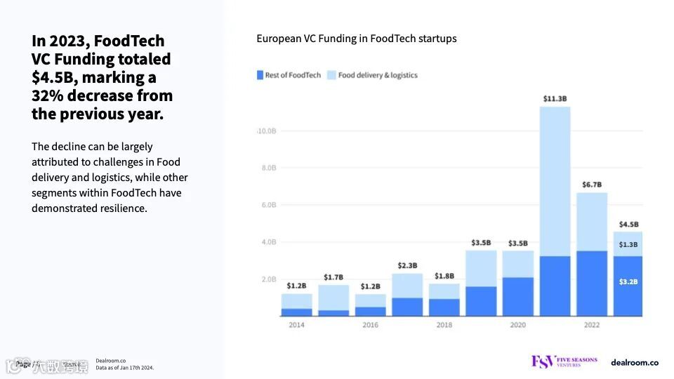 2023年,食品科技风险投资总额为45亿美元,比上年下降32%。