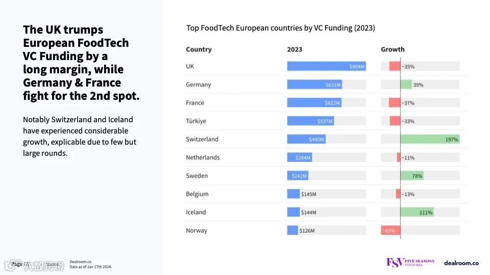 英国远远超过欧洲食品科技风险投资,德国和法国争夺第二名。