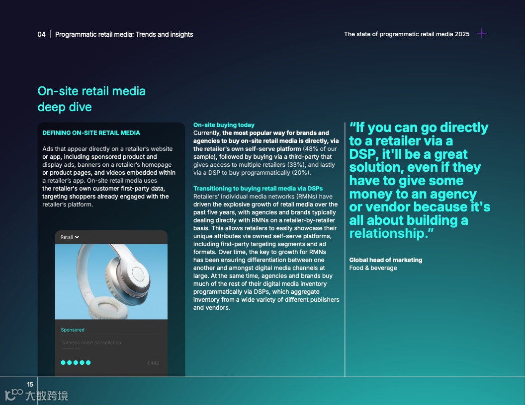 广告程序化购买不仅优化执行,还影响策略。80%的受访者表示,这将使他们更容易将更多预算转向支持DSP的零售商。近半数受访者认为这将引发预算分配的显著变化。采取行动的零售商有望赢得全国性、全漏斗的广告预算。