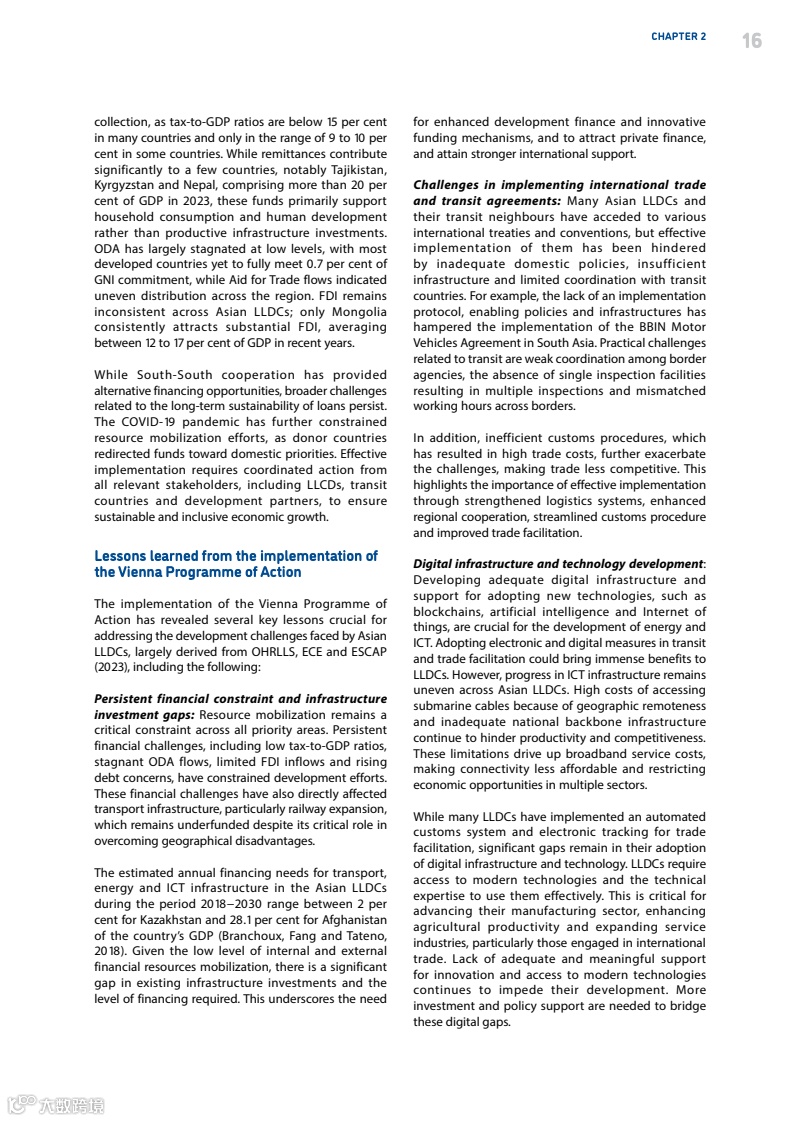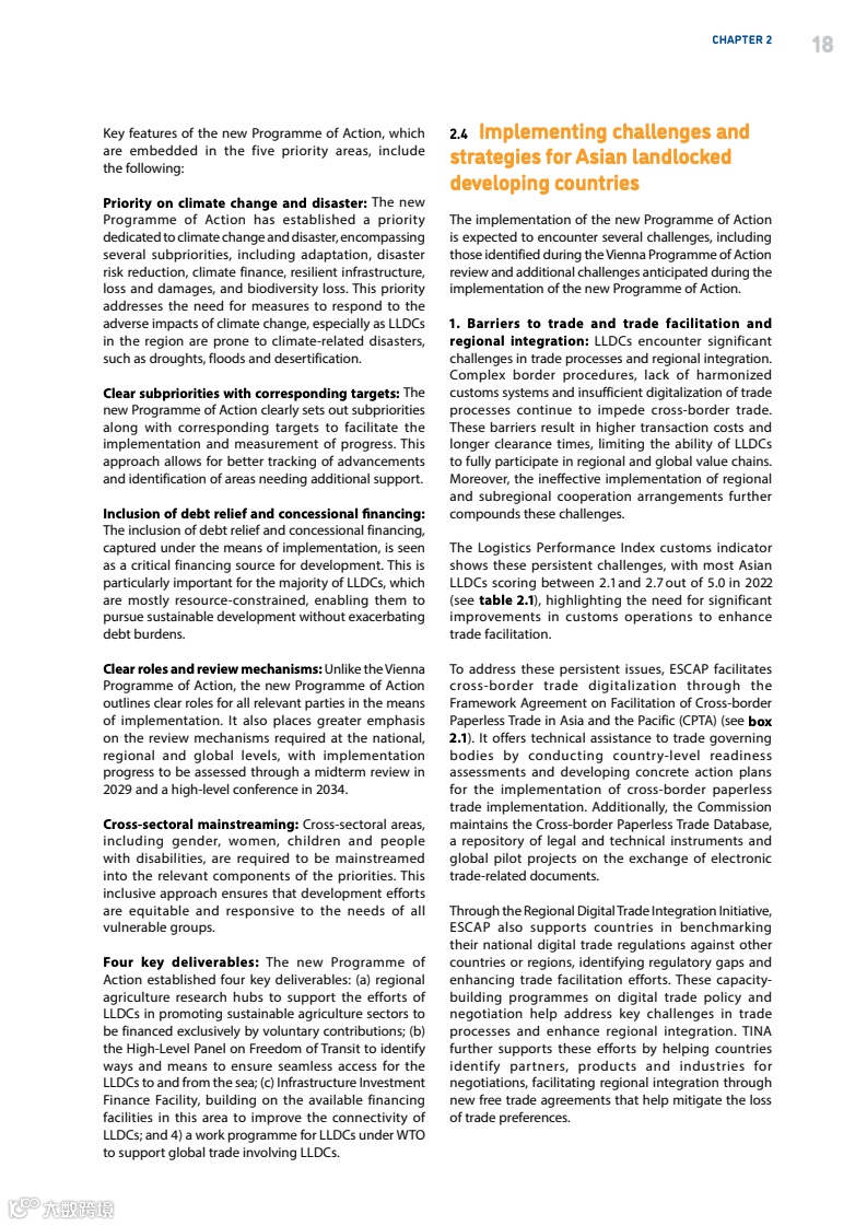 五大领域驱动内陆发展《内陆发展中国家新行动纲领》旨在通过五大优先领域释放其发展潜力:结构转型与科学技术创新;贸易、贸易便利化与区域一体化;过境运输与互联互通;提升适应能力、增强韧性及降低气候变化与灾害脆弱性;实施手段完善机制,弥合差距是关键强调应对内陆发展中国家在贸易、基础设施建设和经济多元化方面挑战的重要性,并借鉴既往计划经验,指出必须强化实施机制、完善监测与问责制度,着力消除承诺与实际进展之间的持续差距