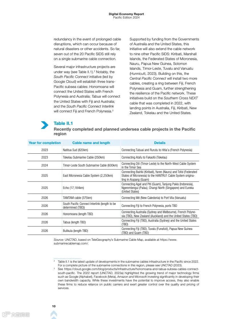 报告首先回顾了2022年报告的成果,并指出数字基础设施、创业和贸易之间的联系。报告强调,尽管太平洋地区在海底电缆和移动网络方面取得了进展,但地理分散和基础设施不足仍然限制了数字服务的获取。报告指出,低地球轨道(LEO)卫星服务为偏远地区提供了宽带接入的潜在解决方案,但高成本和不同的监管方法阻碍了其广泛采用。