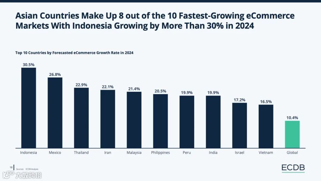 在增长最快的10个电子商务市场中,亚洲国家占8个,其中印度尼西亚在2024年的增长超过30%。