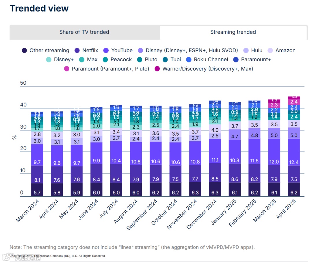 根据尼尔森的月度报告,流媒体在总电视观看时间中的占比连续第三个月创下新高,4月份达到44.3%,较3月份增长0.5个百分点,较1月份增长1.7个百分点。