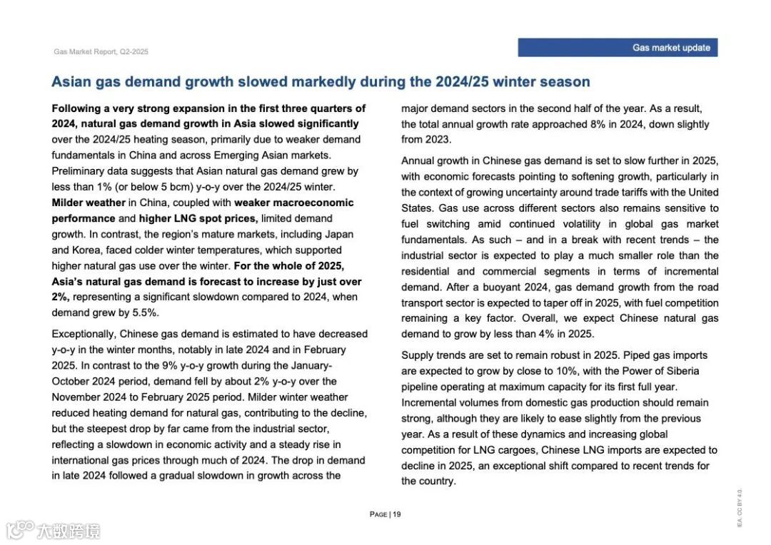 IEA发布了“2025年第二季度天然气市场报告”。在经历2022/23年天然气供应冲击后,2024年天然气需求恢复结构性增长,并在2024/25年采暖季持续扩张。增长主要集中在欧洲和北美,低温等天气条件导致建筑和电力部门天然气使用量增加。相比之下,由于现货液化天然气(LNG)价格上涨和中国冬季气温偏暖,亚洲天然气需求增长放缓。