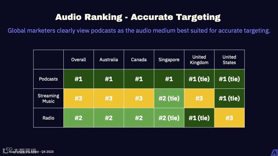 另一个推动播客广告增长的观点是它的有效性。当与流媒体音乐和广播进行比较时,美国受访者将播客(与流媒体音乐)列为准确定向的第一名,并将不可重复的覆盖范围列为第一名。