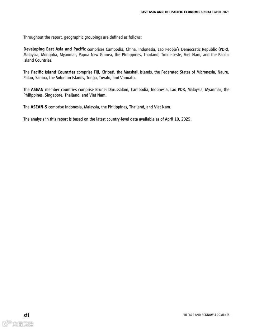 2025年该地区各国的增速预测如下:中国4.0%;柬埔寨4.0%;印度尼西亚4.7%;马来西亚3.9%;蒙古6.3%;老挝人民民主共和国3.5%;菲律宾5.3%;泰国1.6%;越南5.8%。太平洋岛国的增速预测为 2.5%。