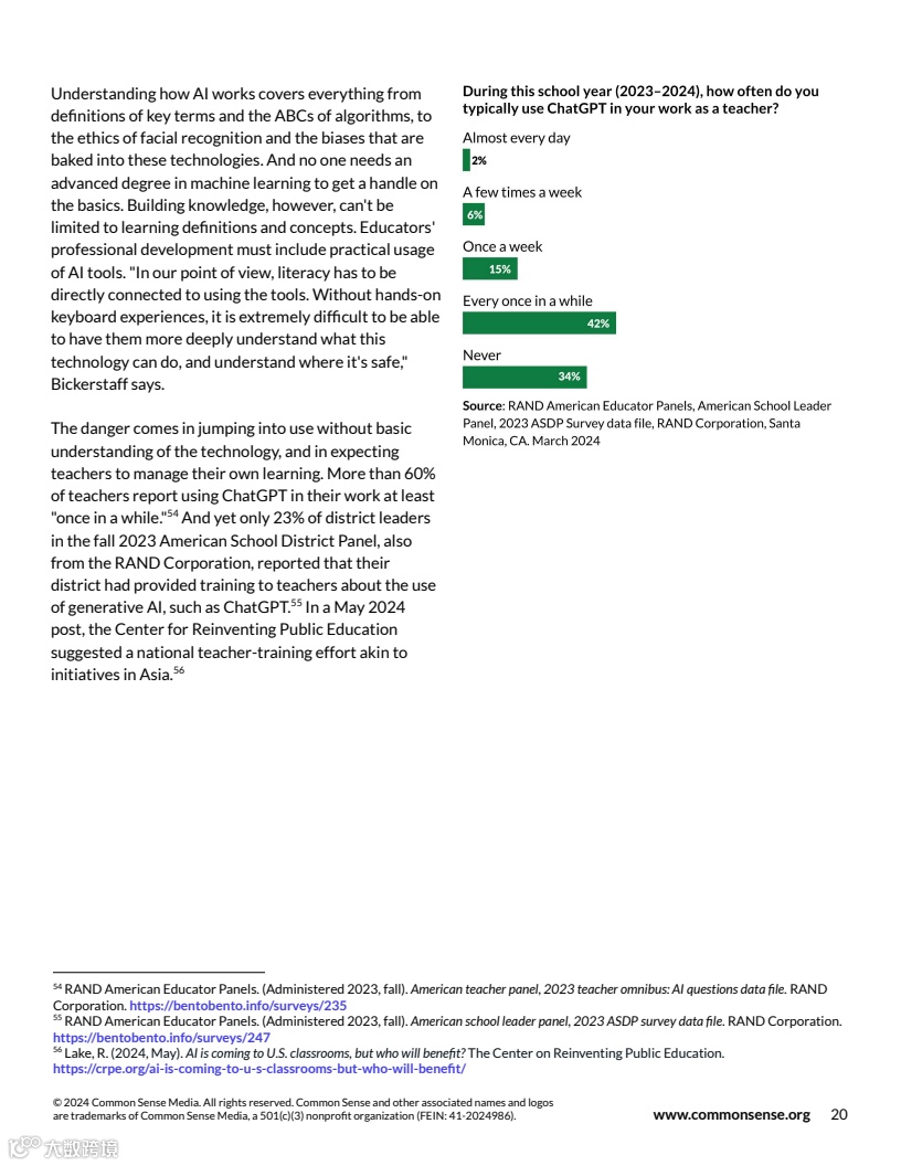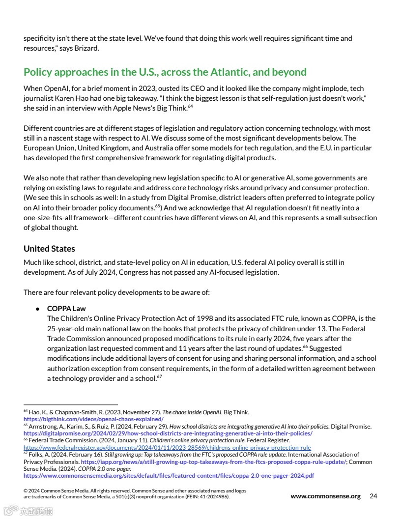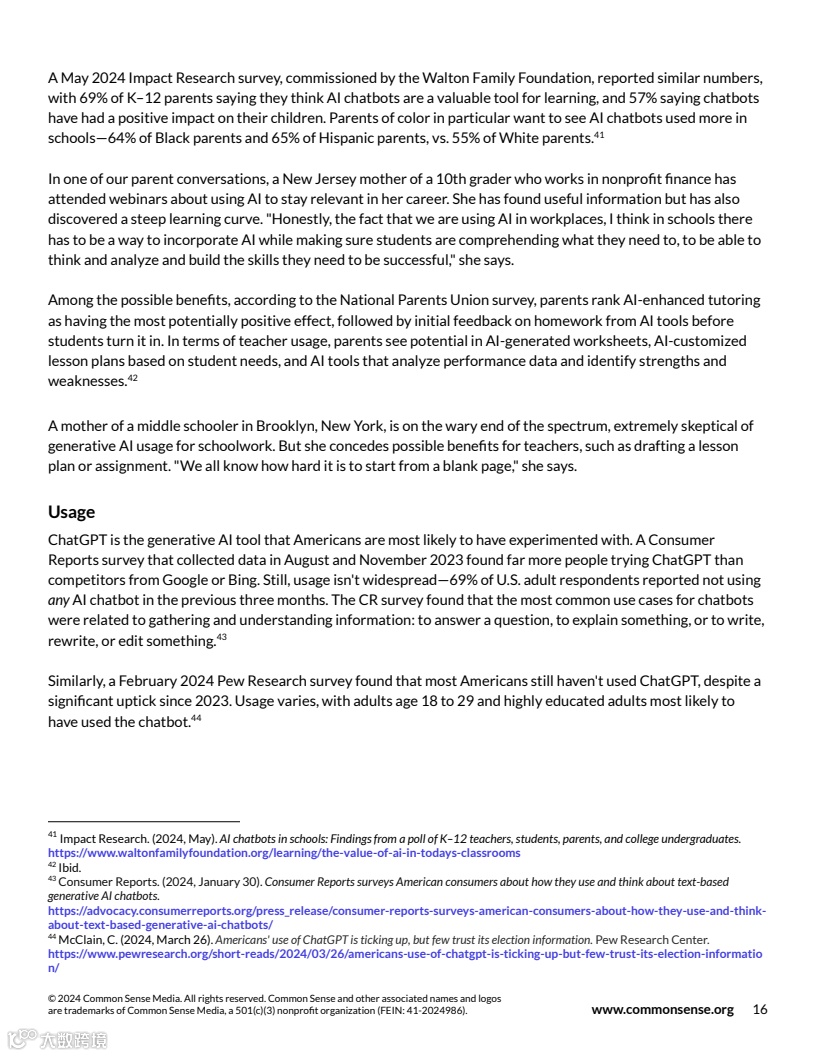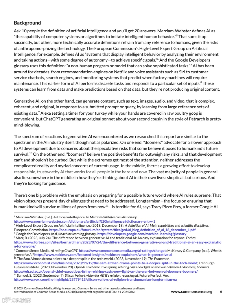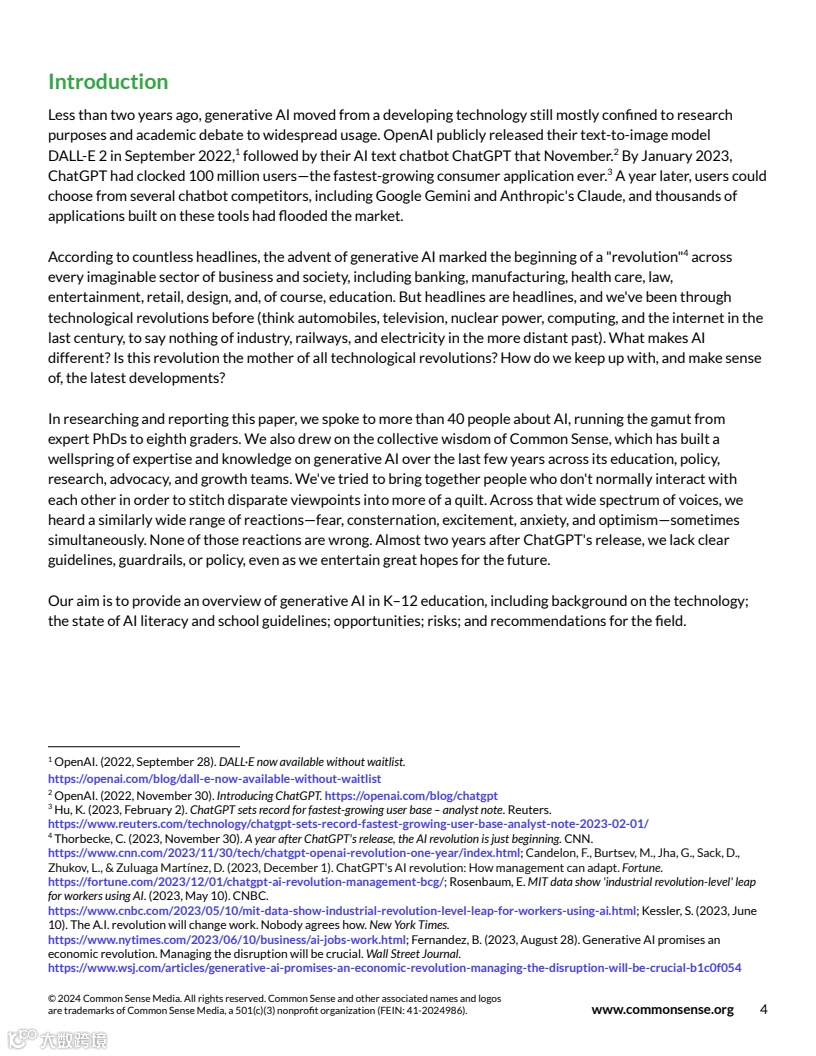 在研究和撰写本报告的过程中,Common Sense与40多人讨论了AI,涵盖了从专业的博士到八年级学生的广泛人群。报告还借鉴了Common Sense的集体智慧,该机构在过去几年中通过其教育、政策、研究、倡导和增长团队,积累了关于生成式AI的丰富专业知识和见解。Common Sense试图将通常不会相互交流的人们聚集在一起,将不同的观点编织成一幅更完整的图景。在这些广泛的声音中,我们听到了同样多样的反应——恐惧、惊愕、兴奋、焦虑和乐观——有时甚至是同时出现的。这些反应都没有错。在ChatGPT发布近两年后,尽管我们对未来抱有巨大希望,但仍缺乏明确的指导方针、护栏或政策。