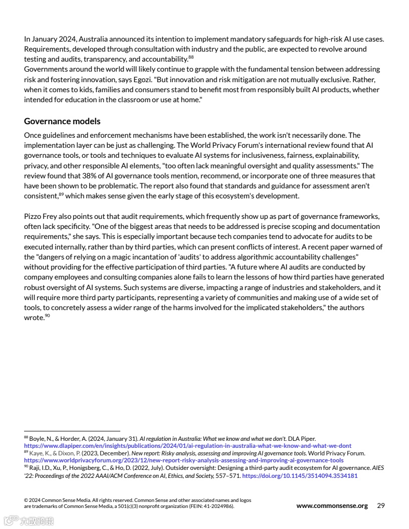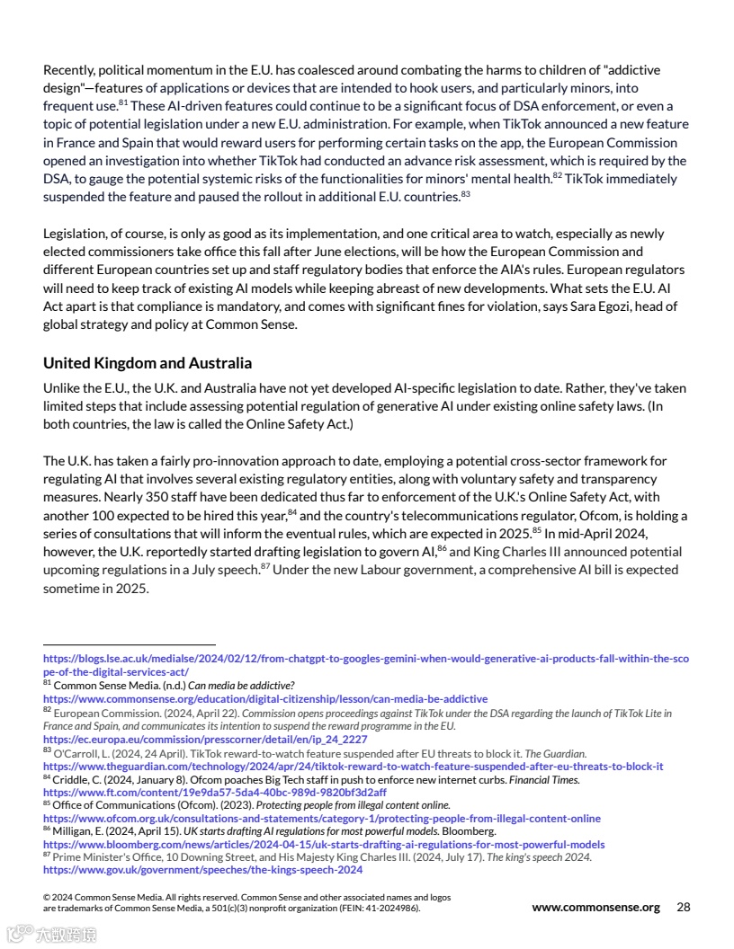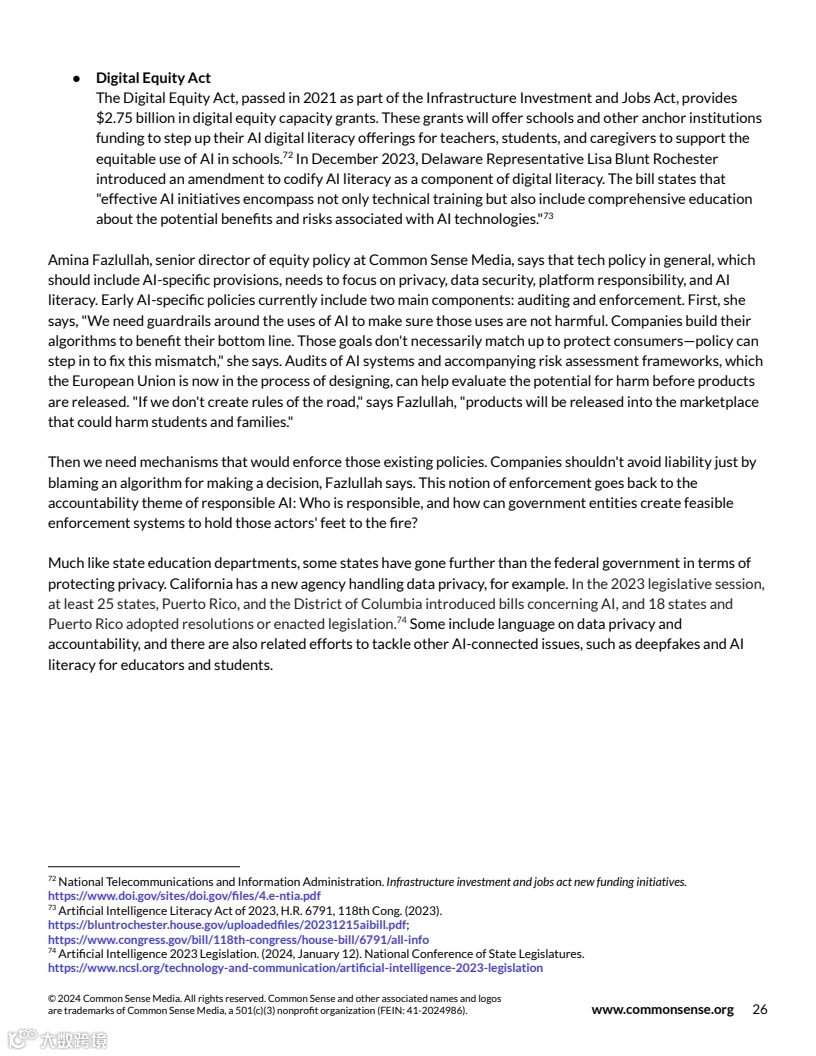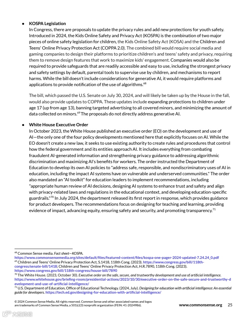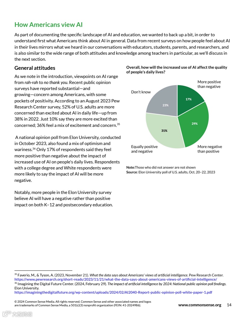在研究和撰写本报告的过程中,Common Sense与40多人讨论了AI,涵盖了从专业的博士到八年级学生的广泛人群。报告还借鉴了Common Sense的集体智慧,该机构在过去几年中通过其教育、政策、研究、倡导和增长团队,积累了关于生成式AI的丰富专业知识和见解。Common Sense试图将通常不会相互交流的人们聚集在一起,将不同的观点编织成一幅更完整的图景。在这些广泛的声音中,我们听到了同样多样的反应——恐惧、惊愕、兴奋、焦虑和乐观——有时甚至是同时出现的。这些反应都没有错。在ChatGPT发布近两年后,尽管我们对未来抱有巨大希望,但仍缺乏明确的指导方针、护栏或政策。