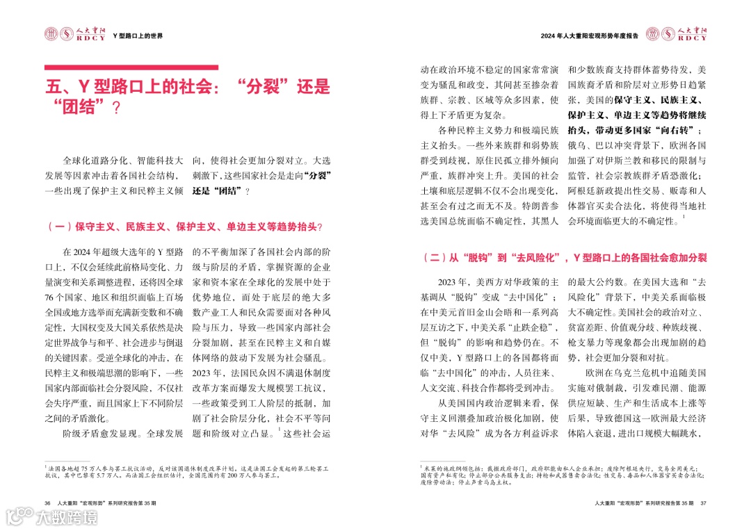 2024 年,那些“进而分叉”的国家在政治、安全、经济、金融、社会等五个维度面临“Y”型路口的抉择。政治维度,面临政策方针的“颠覆”或“保持”的抉择;安全维度,面临“冲突”或“合作”的抉择;经济维度,面临“保守”或“开放”的选择:金融维度,面临“风险”或“稳定”的考验;社会维度,存在“分裂”或“团结”的隐忧。