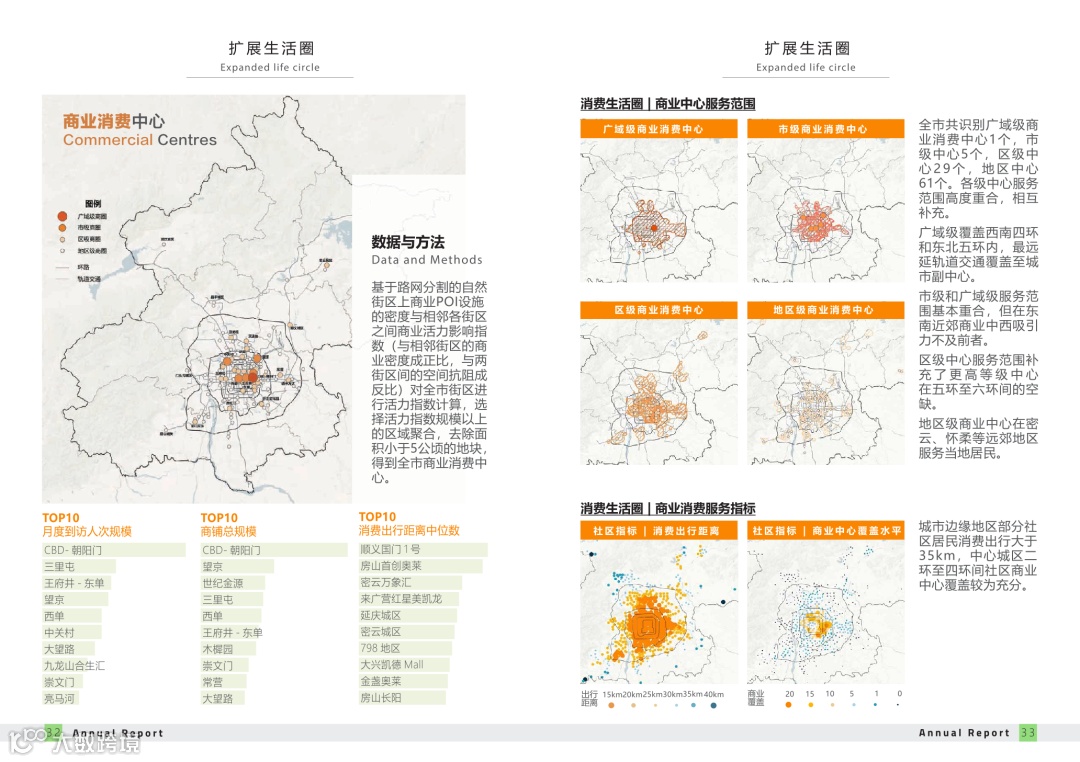 全市共识别广域级商业消费中心1个,市级中心5个,区级中心29个,地区中心61 个。广域级中心服务半径约25km,客群前往的交通方式主要为私家车、出租车和 轨道交通;市级中心服务半径约15km,交通方式为公交与轨道交通;区级中心服 务半径10km,公共交通方式可达;地区级中心服务半径5km,步行、骑行和公共 交通方式可达。