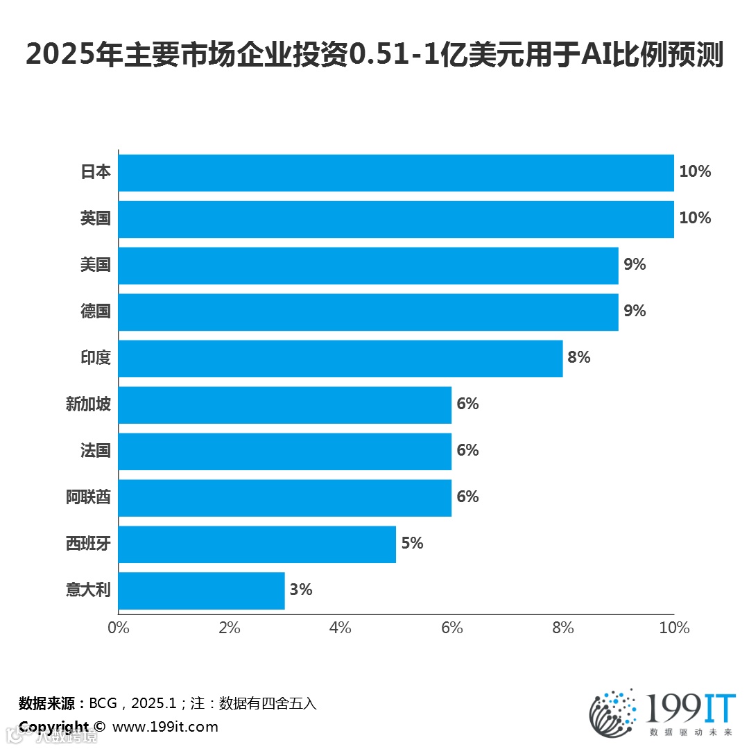导读:2025年主要市场企业投资0.51-1亿美元用于AI比例预测