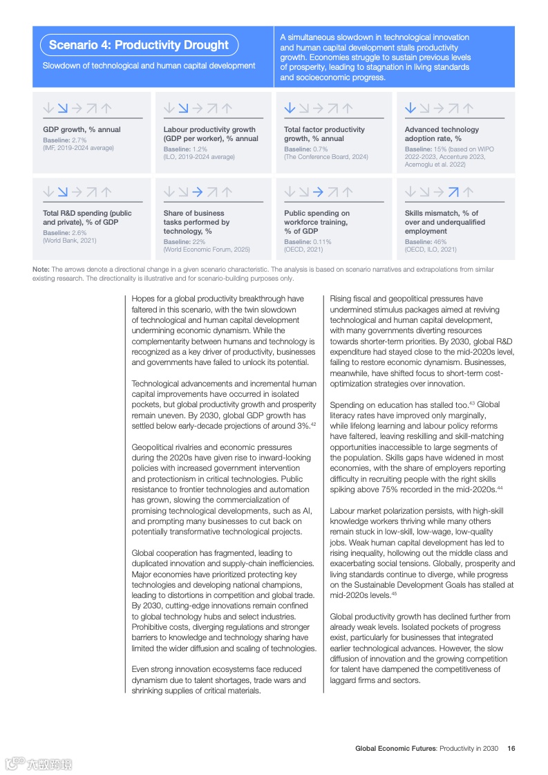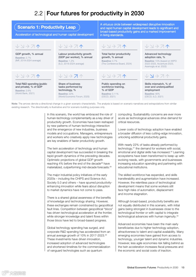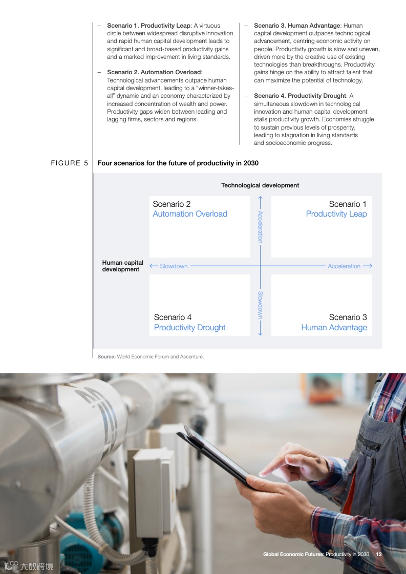 分析两个关键生产力驱动因素——技术和人力资本——的潜在加速和放缓的相互作用,可以得出以下四种未来: