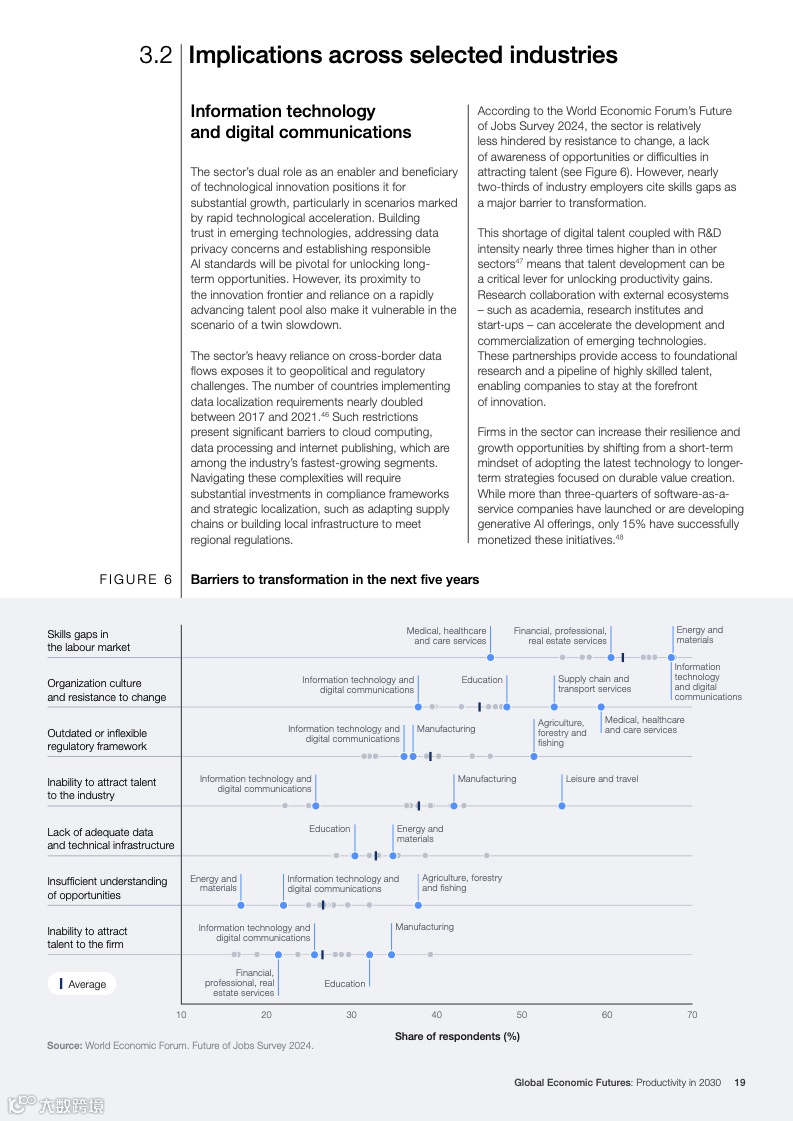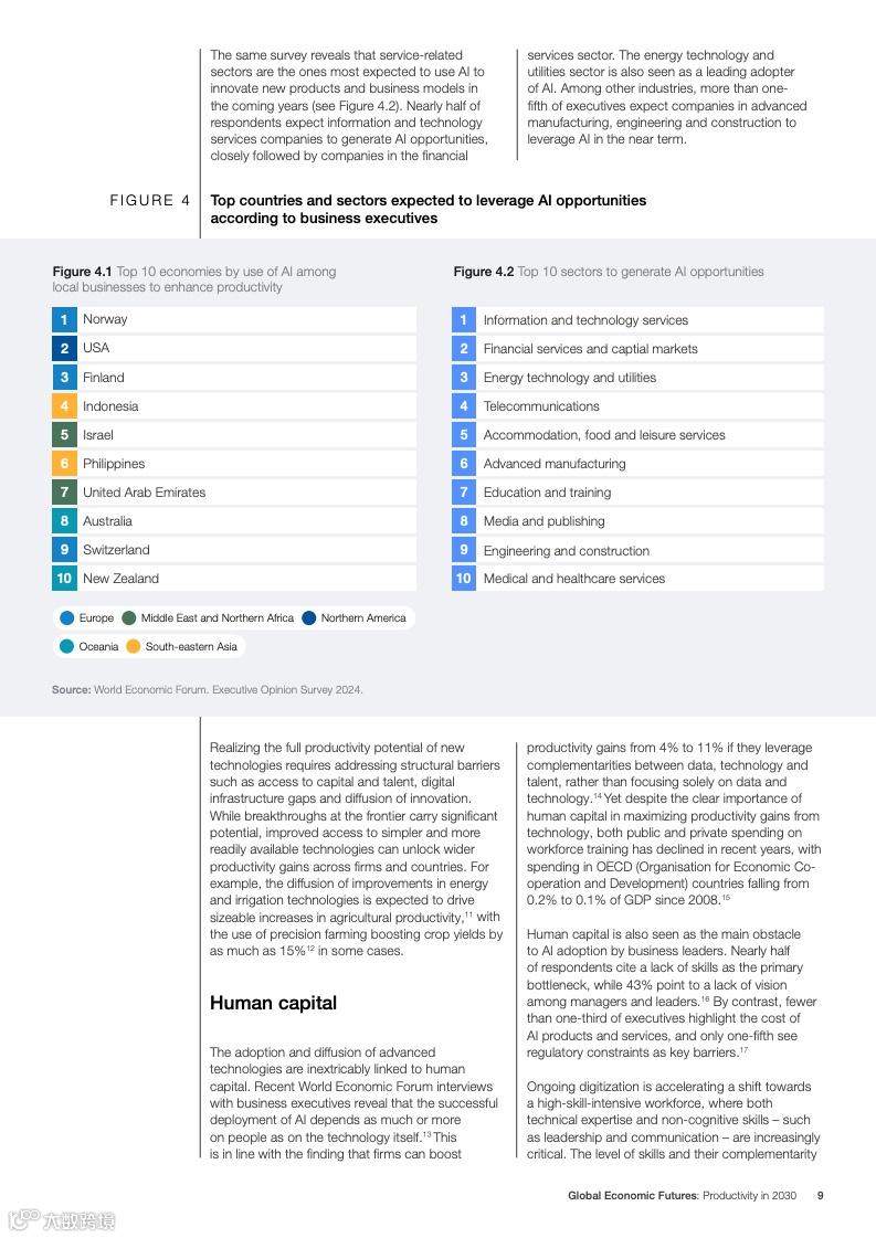 人力资本开发对于扭转生产率放缓也至关重要,尤其是因为它在释放技术收益方面发挥着重要作用。近一半的全球企业高管认为,缺乏劳动力技能和有远见的领导力是采用人工智能的主要障碍。