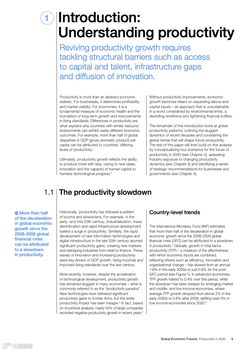从历史上看,生产力一直是全球增长的关键动力,提高了生活水平和经济活力。然而,近几十年来,生产率增长几乎陷入停滞,2008年以来全球增长减速的一半以上可归因于这一放缓。