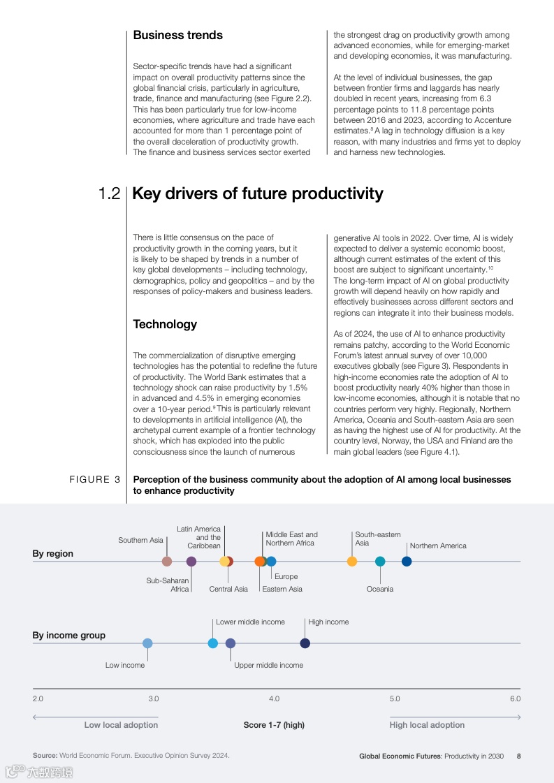 以人工智能(AI)为例,高收入经济体的企业高管对该技术提高生产率的评价比低收入经济体的同行高出近40%。就行业而言,他们预计未来几年人工智能将在信息和技术服务、金融服务和能源技术领域得到最大利用。