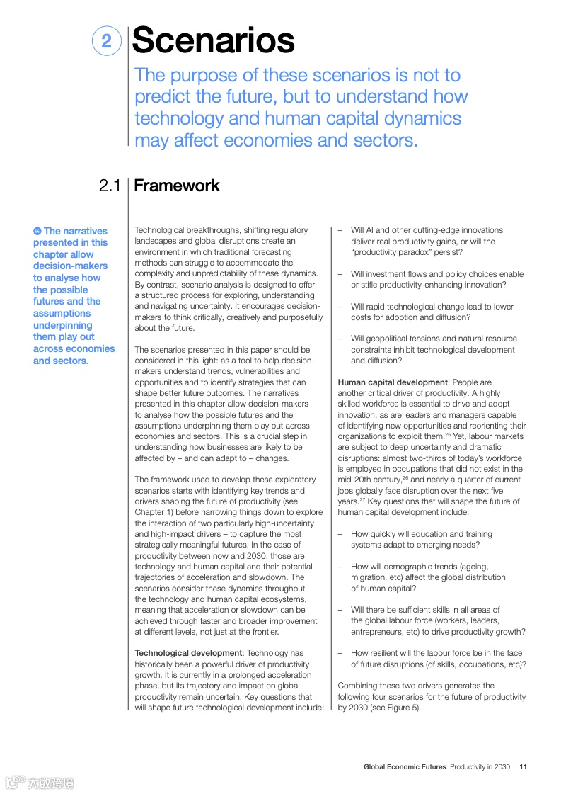 情景分析为探索、理解和驾驭不确定性提供了一个结构化的过程。这一分析的目的不是预测2030年的世界会是什么样子,而是鼓励决策者对未来进行批判性、创造性和目的性的思考。