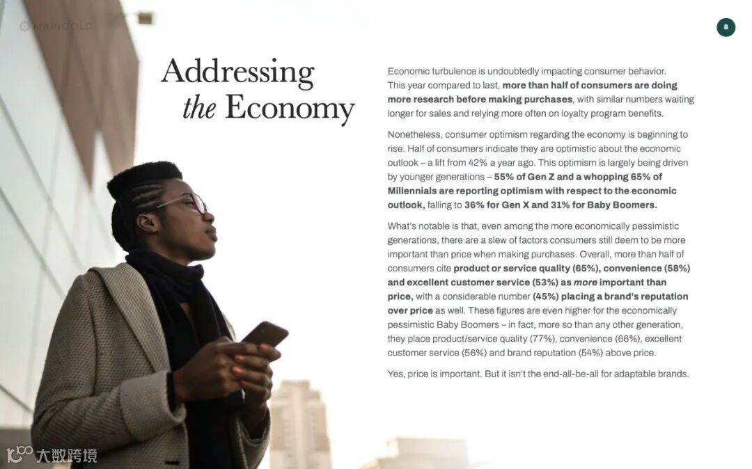 50%的消费者对经济前景持乐观态度,千禧一代的比例最高,为65%;婴儿潮一代的比例最低,为31%。