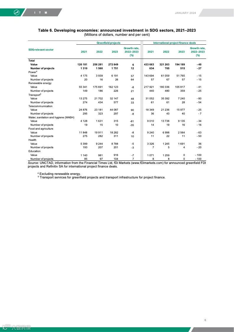 在发达经济体当中,国际投资项目公告全盘下降:并购价值比2022年减少了2800亿美元,直接抑制了外国直接投资的流动;项目融资额也减少了1570亿美元,而绿地项目公告的价值降低还将影响2024年的外国直接投资。