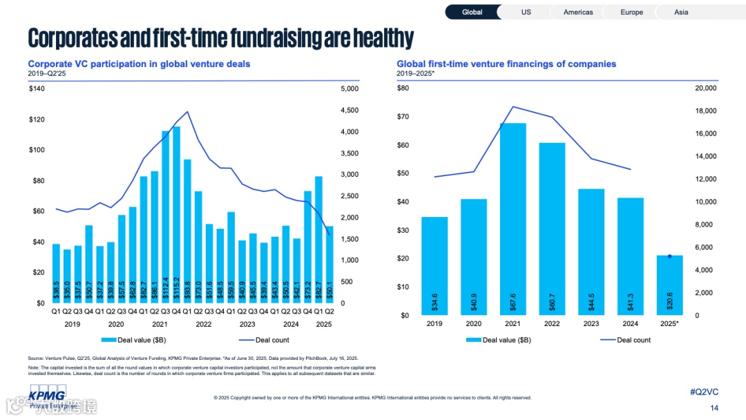 企业风险投资(CVC)从2025年第一季度的827亿美元降至2025年第二季度的502亿美元,其中美国占362亿美元。亚洲CVC创十年新低,60亿美元。