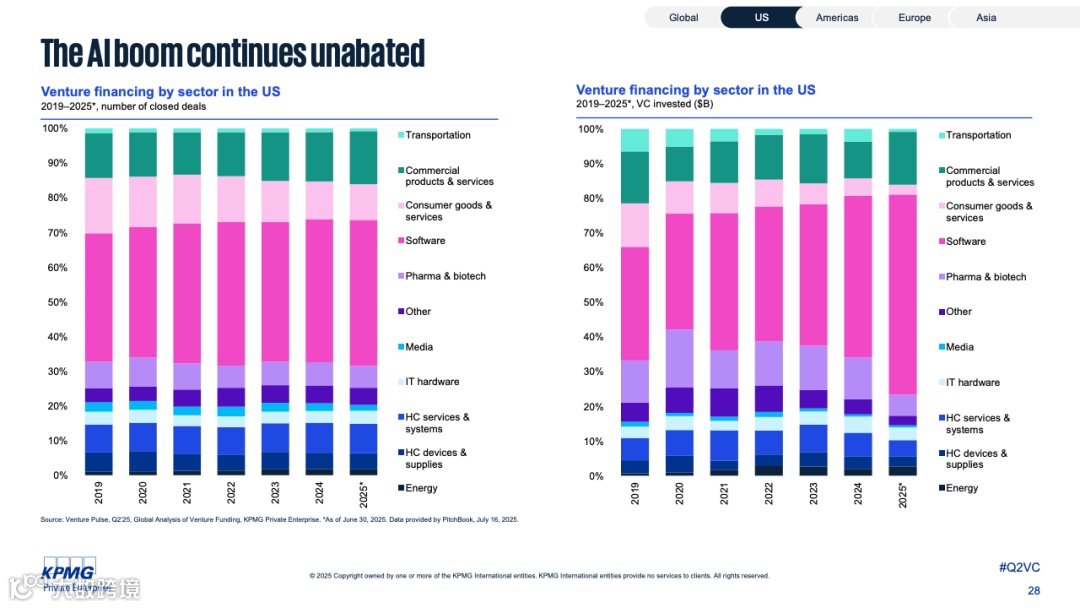 美洲引领全球风险投资,在2025年第二季度获得了727亿美元,占全球融资总额的70%以上;其中超过700亿美元来自美国。欧洲以146亿美元(1,733笔交易)远远落后位居第二。亚洲继续表现低迷,仅获得128亿美元(2,022笔交易)。