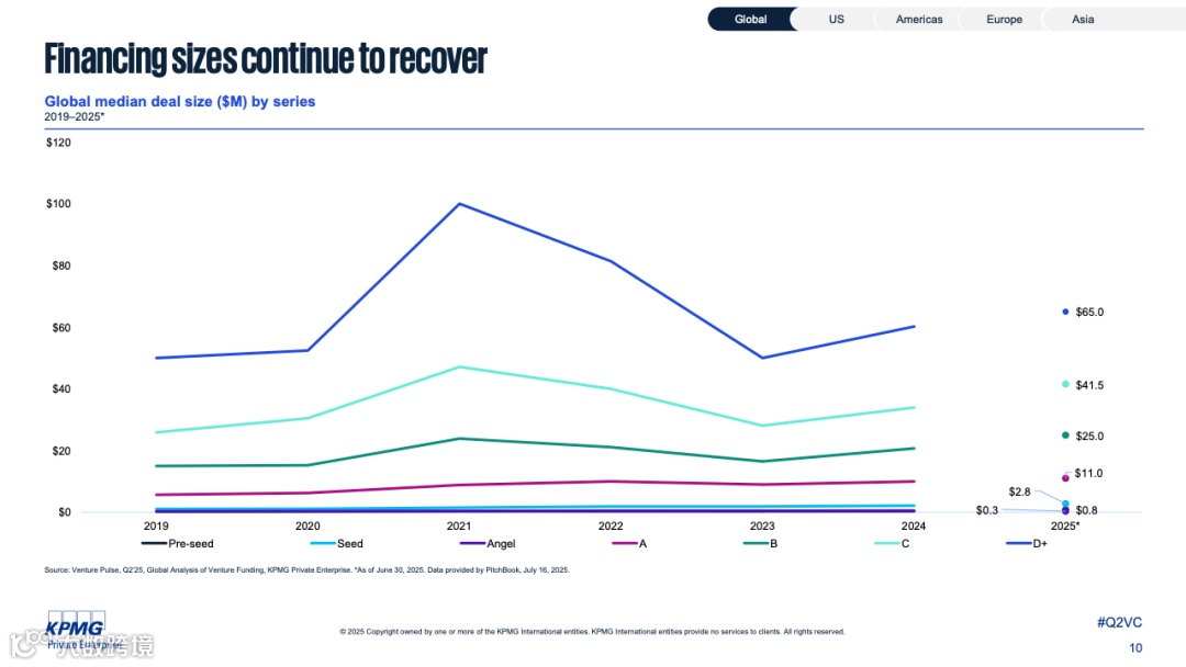 美洲风险第二季度投资环比从985亿美元降至727亿美元,主要受美国拖累——同期投资从930亿美元降至700亿美元。欧洲风险投资保持稳定(146亿美元),亚洲则遭遇十多年来最弱季度之一(2025年第二季度仅128亿美元)。