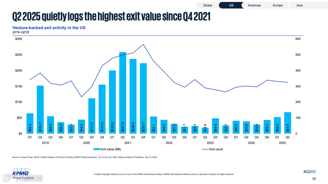 全球投资退出价值从第一季度的889亿美元升至第二季度的1,111亿美元。美国投资退出额从524亿美元增至678亿美元,亚洲从192亿美元增长至297亿美元,欧洲则从136亿美元降至116亿美元。