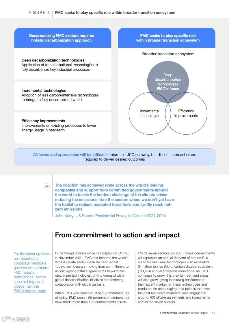 本报告概述了先行者联盟(FMC)自2021年11月成立以来的目标和成就。在不到三年的时间里,FMC的成员已经发出了世界上最大的私营部门对突破性低碳技术的需求信号,这些技术通常可以减少80%或更多的碳排放。
