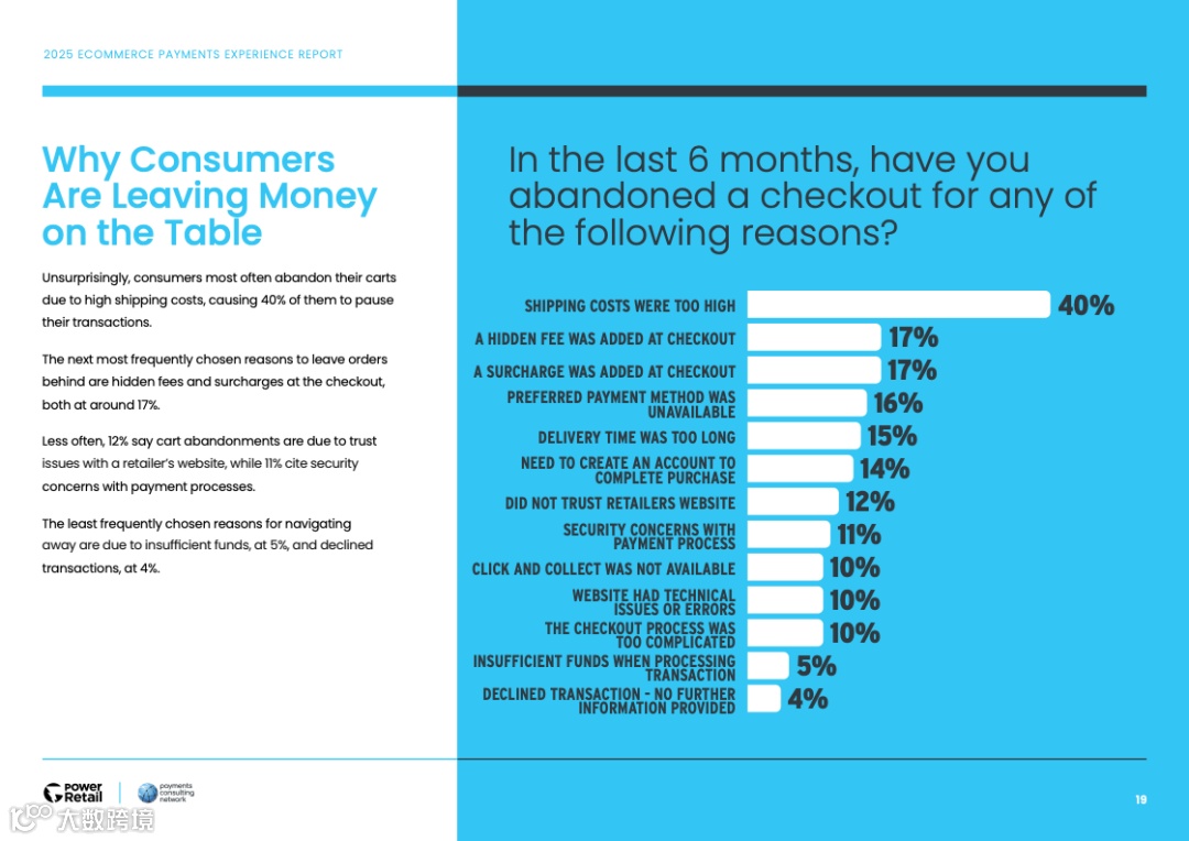 支付环节的信任与透明度是决定交易成败的“最后一公里”。高达40%的购物车放弃率源于过高的运费,而17%则是因为结账时出现的隐藏费用。此外,缺少偏好的支付方式(16%)以及对网站安全性的疑虑(12%)也是导致交易中断的重要因素。这表明,无缝且安全的支付体验是提升转化率的核心。
