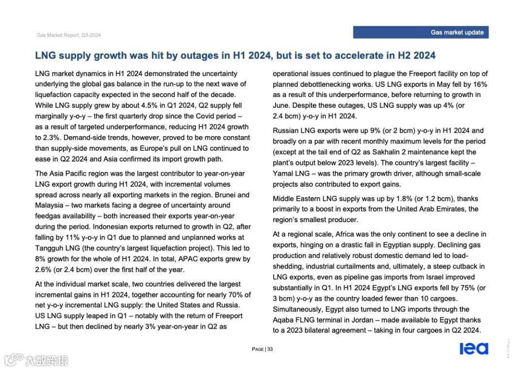 初步数据显示,2024年上半年全球天然气需求增长了3%。