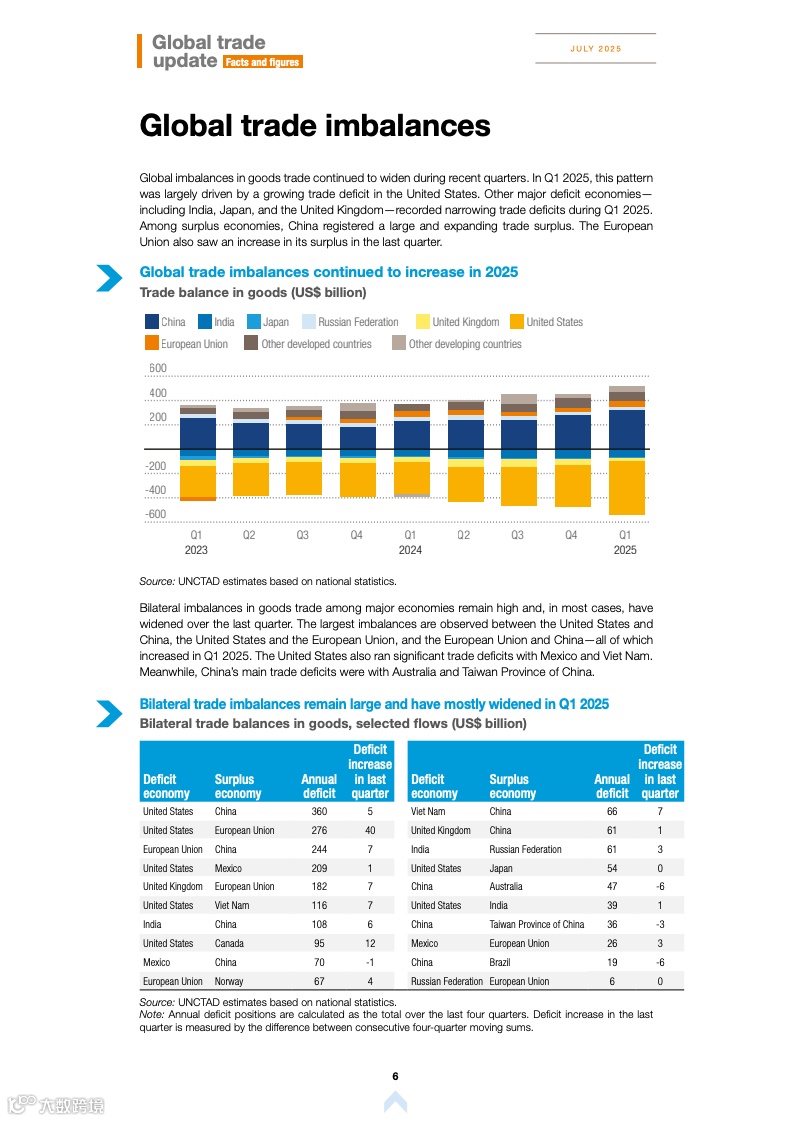 报告指出,发达国家在2025年第一季度的贸易增长表现优于发展中经济体,这一趋势与过去几年全球南方主导增长的情况形成反转。其中,美国进口同比增长14%,欧盟出口则增长6%。