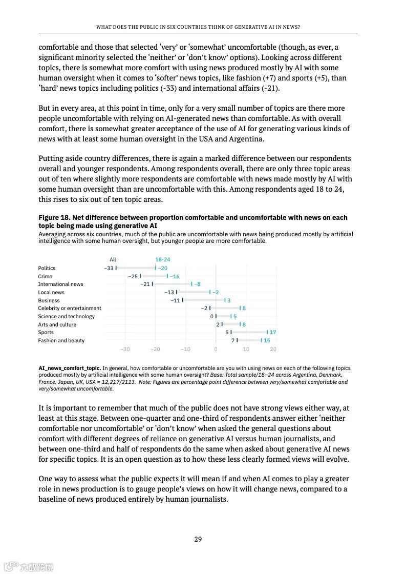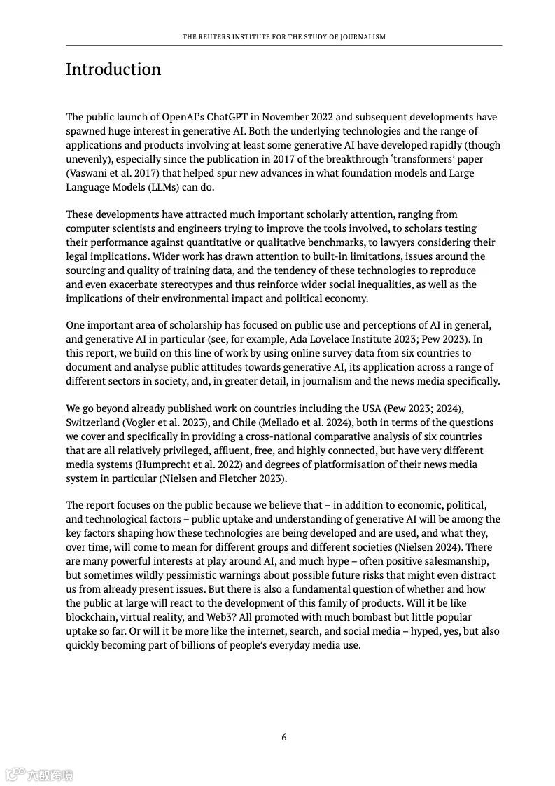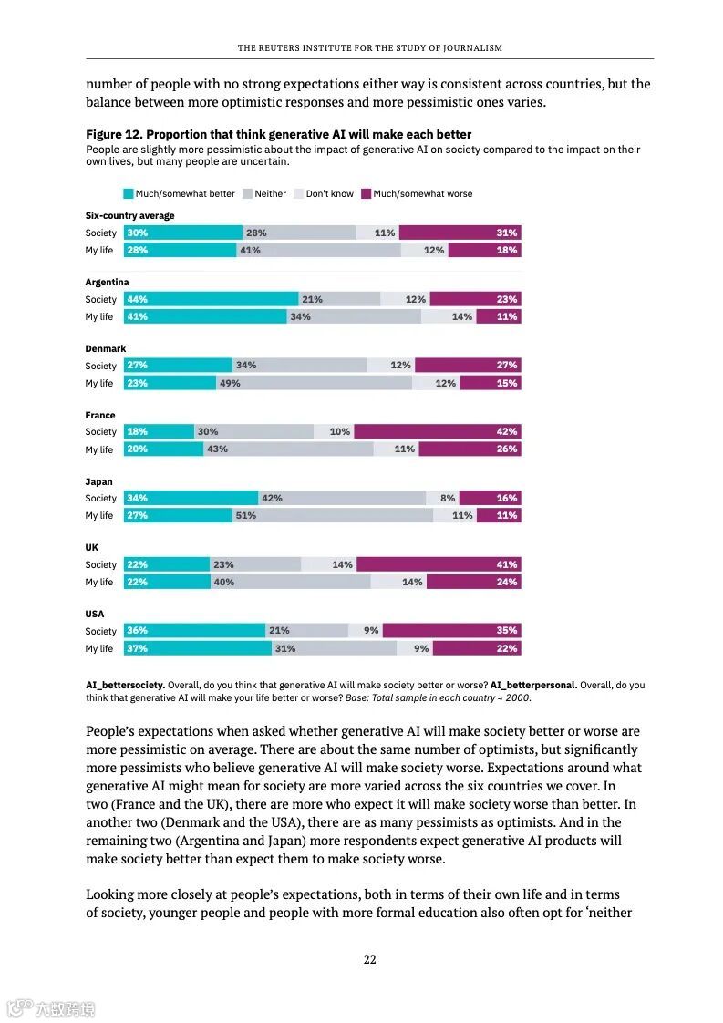 路透社和牛津大学发布了新报告“AI和未来的新闻”。路透社在6个国家(阿根廷、丹麦、法国、日本、英国和美国)开展了一项在线调查,旨在了解人们是否以及如何使用生成式人工智能,以及他们对AI在新闻和其他工作和生活领域的应用的看法。