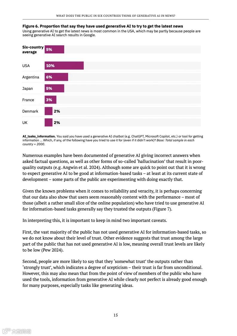 在被调查的6个国家中,只有5%的人使用生成式人工智能来获取最新新闻。