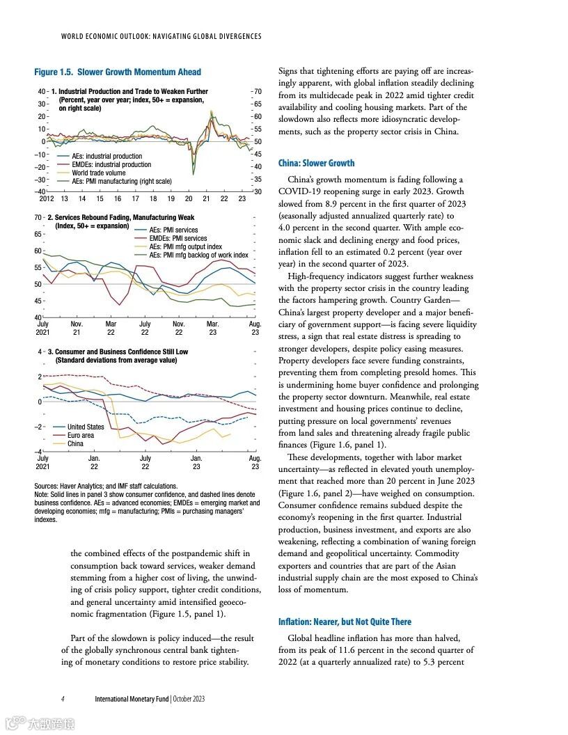 许多新兴市场经济体展现出的韧性也强于预期。新兴市场和发展中经济体2023年和2024年的经济增速预计将小幅下降,从2022年的4.1%降至2023年和2024年的4.0%。但中国是一个明显的例外,其面临着房地产危机和信心减弱带来的日益严峻的阻力。基金组织预测中国2023年经济增速为5%,相比7月预测下调了0.2个百分点。