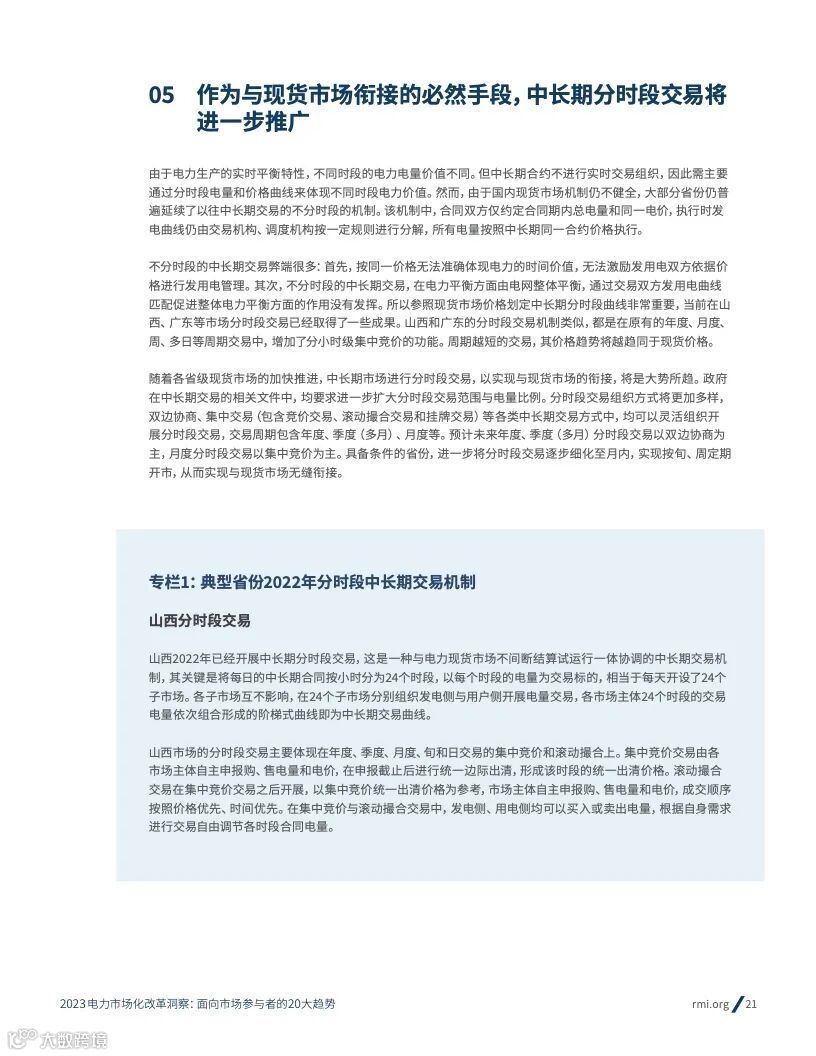 在此背景下,未来几年对中国实现碳达峰和持续推进电力市场化改革至关重要。首先,目前各省在现货市场和辅 助服务市场等短周期交易方面普遍刚刚起步,亟待进一步巩固基础、形成连续机制。第二,在可再生多年合约这 样的长周期交易方面,目前的机制尚未真正发挥稳定投资预期、大规模吸引社会资本的作用,仍然有很大改善空 间。第三,在2025初步建成全国统一电力市场体系的目标下,目前在多层次市场协同运行、跨省跨区灵活调度与 交易方面仍面临众多挑战,迫切需要打破行政壁垒、优化资源配置。我们判断,上述提到的几个方向,在接下来 几年都会有比较密集的改革动作,需要保持密切关注。