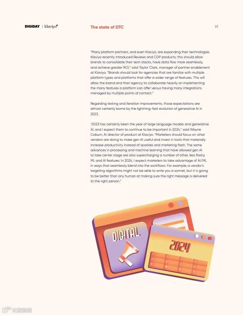 但是,在他们为 2024 年制定计划时,围绕着不断扩大的数字广告生态系统、人工智能驱动的测试和更好的运输/装运系统,他们将获得更多机遇,本报告还解读了强大的合作伙伴关系,以及DTC营销人员可以向代理机构和其他外部团队提出哪些要求,以确保未来一年的营销活动取得成功并实现盈利。