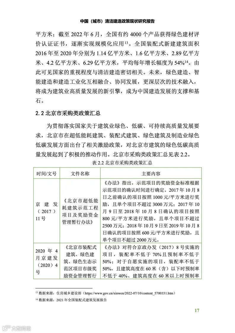 在规划类政策方面,国家及目标城市出台了较多前瞻性的规划 政策或文件,引导企业实施清洁建造,并向绿色低碳方向转变。国 家层面从 2013 年开始出台了系列相关政策,引导建材企业生产绿色 低碳建材,建筑企业使用绿色低碳建材,提升建材使用效率,促进 绿色低碳建材的生产和应用。目标城市重点从五年发展规划和碳达 峰实施方案在绿色低碳设计、绿色低碳建材、新型建筑工业化等方 面出台相关政策,促进地方建筑业的绿色发展。