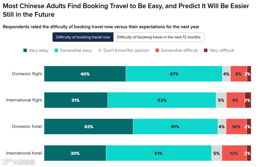 目前往返美国可能是一个挑战,但令人鼓舞的是,大多数中国成年人发现,无论是国内旅行还是国际旅行,预订机票和酒店都相对容易。对未来也有乐观的迹象:大多数人还认为明年预订旅行会变得更加容易,大约1/4的人认为会保持不变,只有一小部分人预测会变得更加困难。