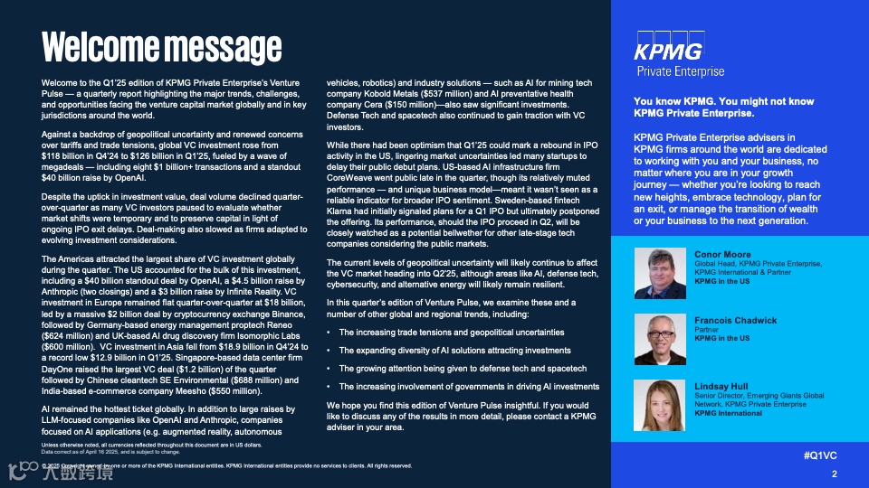 line-height:1.6;letter-spacing:0.034em;font-style:normal;font-weight:normal;">2025年第一季度风险投资交易总值的整体增长主要受到人工智能公司一系列大型融资的推动,其中包括OpenAI创纪录的400亿美元融资。