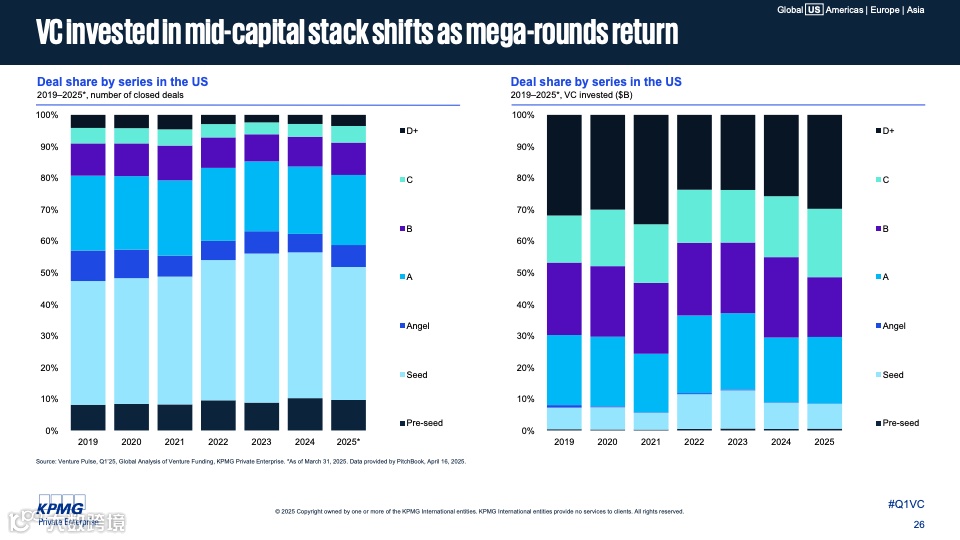 美洲地区在2025年第一季度吸引了945亿美元的风险投资,占全球总额的近3/4,其中美国占915亿美元。欧洲保持相对平稳,1883笔交易共获得180亿美元。亚太地区继续下滑,2149笔交易仅获得129亿美元投资。