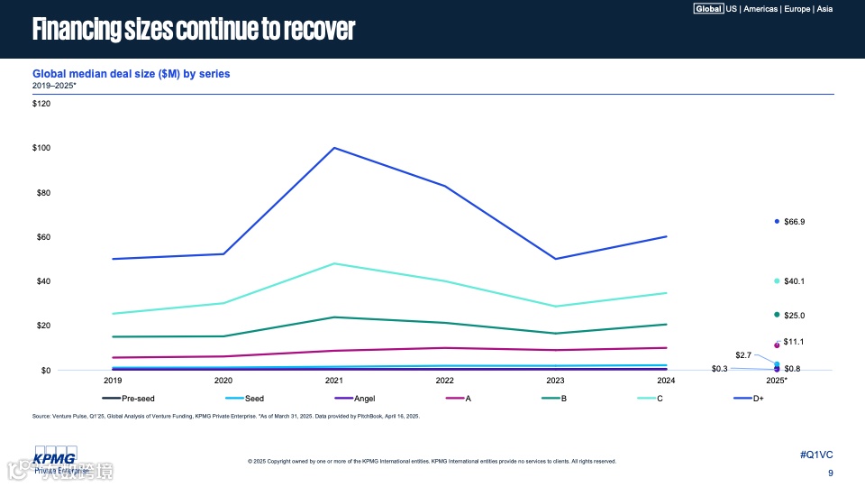 在美洲和欧洲,D轮及以上交易的中位数规模大幅增长,美洲地区从9160万美元增长到9620万美元,欧洲地区从8450万美元增长到1亿7750万美元。