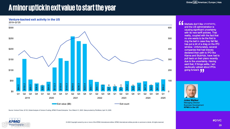 投资退出价值相对低迷,全球仅为782亿美元。从地区来看,美国的退出活动有所增加,但亚太地区仅66亿美元,为该地区自2015年以来的最低水平。