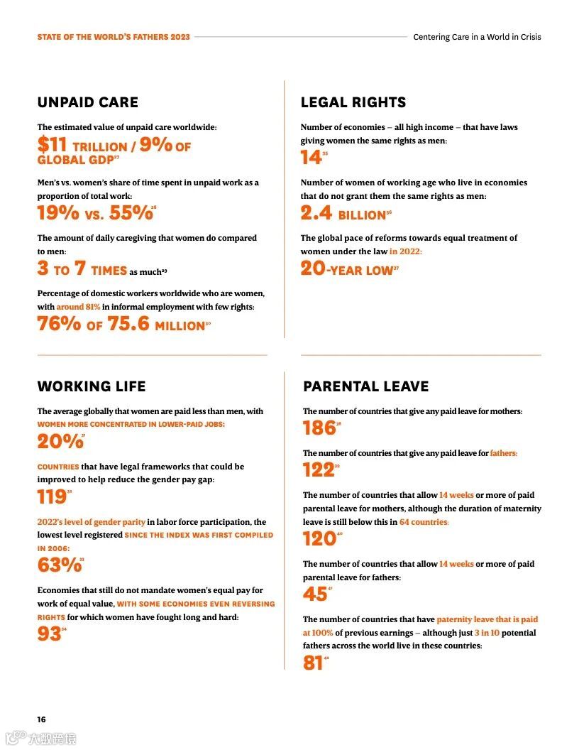 MenCare发布了“2023年全球父亲报告”。根据国际劳工组织(ILO)的数据,每天有超过160亿小时的无偿护理工作,如果按最低工资支付,这一数字将占全球GDP的9%,或每年约11万亿美元。