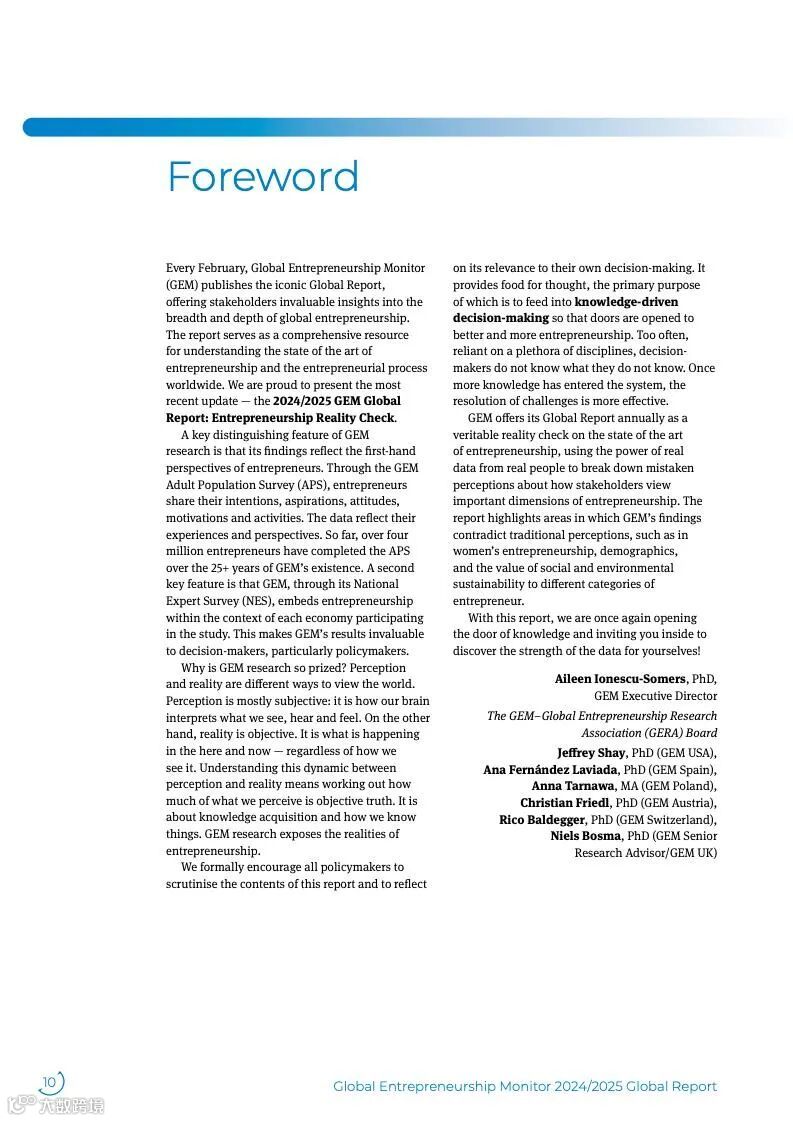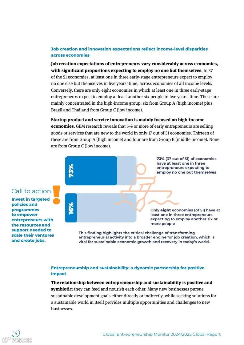25年来,GEM持续且细致地测量了全球120多个经济体的创业活动,逐步建立了世界上最广泛的创业活动数据库,使跨经济体的比较和趋势识别成为可能。简而言之,创业是未来繁荣的关键动力,是经济发展过程中的重要组成部分,并且在当今世界,创业为解决一些全球最严峻的环境和社会挑战提供了急需的解决方案。从某种意义上说,创业是一种终极投资:投入时间、精力和资源以构建未来的企业。创业不仅是对创业者自身未来的投资,也是对经济的投资;随着新企业越来越多地致力于实现可持续发展目标,它也是对人和地球的坚实投资。