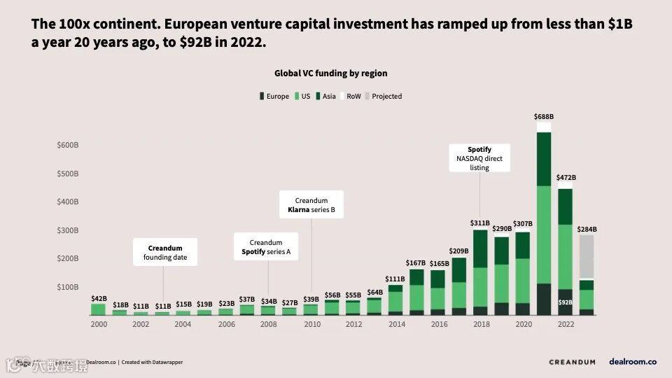 欧洲的风险投资从20年前的每年不到10亿美元增长到2022年的920亿美元。