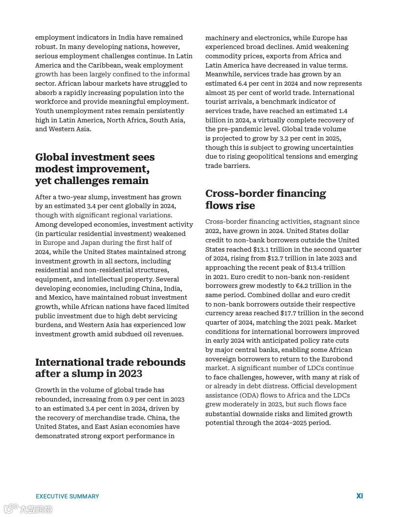 报告指出,通胀下降和许多经济体持续实施的货币宽松政策可能在 2025 年为全球经济活动带来适度提振。然而,不确定性依然显著,地缘政治冲突、加剧的贸易紧张局势以及世界多地高企的借贷成本构成了主要风险。这些挑战对于低收入的脆弱国家尤为严峻,可能会进一步破坏实现可持续发展目标的进展。